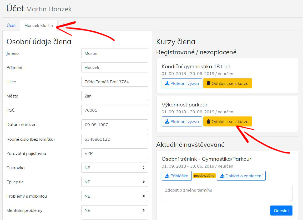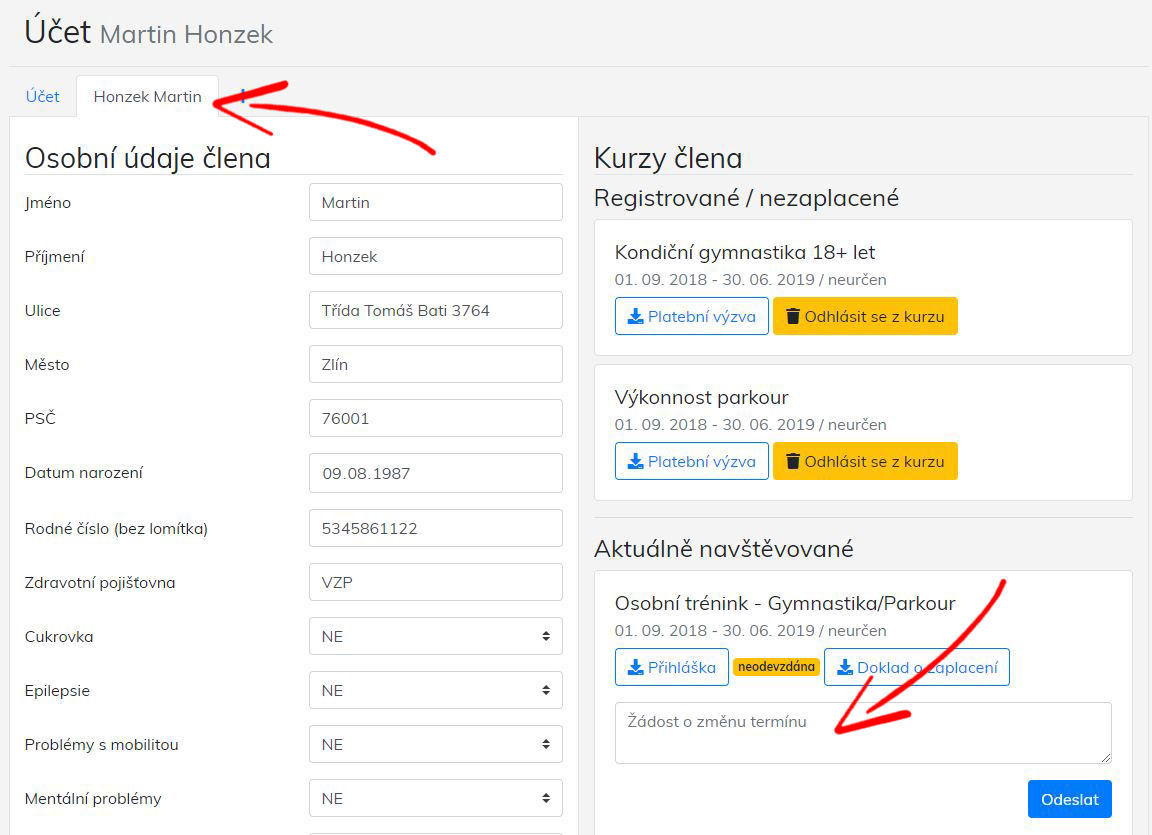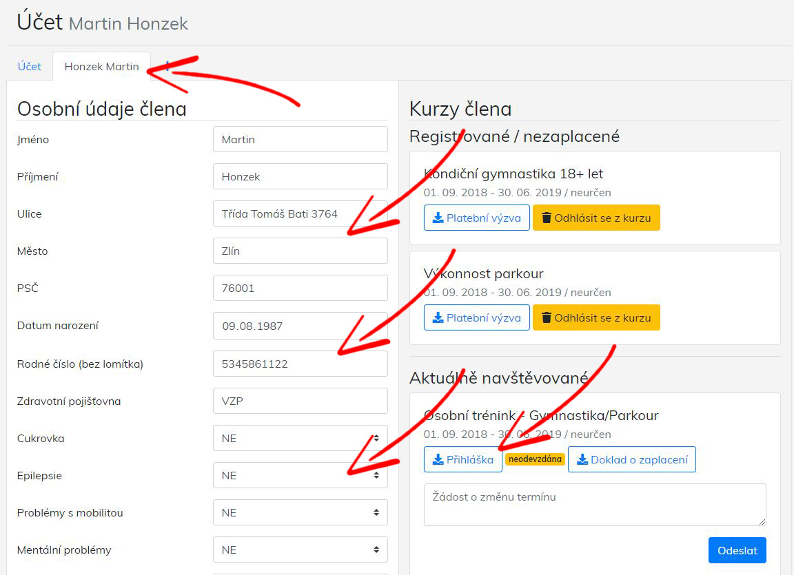 V záložce klienta, "Příjmení Jméno" (Vašeho dítěte), naleznete informace o sportovci. Tyto informace jsou povinné a slouží k registraci dítěte či člena našeho spolku u Ministerstva školství a tělovýchovy a České gymnastické federace. Po doplnění máte v budoucnu možnost tisknout přímo ze systému "Přihlášku" do kurzu. Pokud Vám svítí vedle Přihlášky "neodevzdána", vytiskněte, prosím, aktuální přihlášku ještě jednou a dodejte ji svému trenérovi.