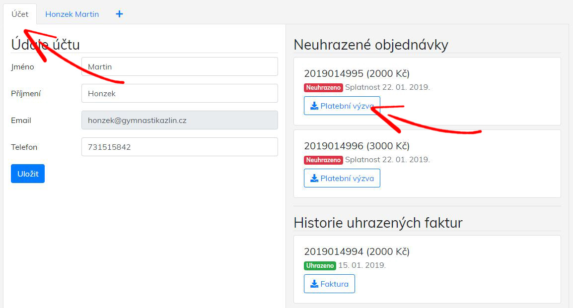 Po přihlášení vidíte základní uživatelské rozhraní systému. V záložce "účet" jsou základní informace o Vás, tedy uživatele přihlašovacího účtu (většinou zákonný zástupce). V tomto okně naleznete historii uhrazených faktur a "platební výzvu", tedy předpis (proforma fakturu) k platbě za následující pololetí. Zde prosím zkontrolujte a doplňte Vaše údaje, které budou sloužit k zasílání výzev k platbě a ke komunikaci v naléhavých situacích (zranění, zrušení kurzu aj.) Vyplňujte, prosím, funkční a navštěvovaný e-mail.