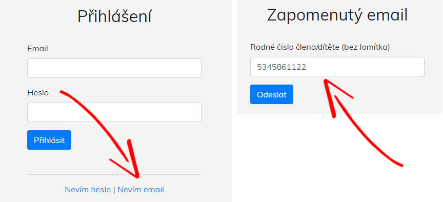 Pokud je "uživatel nenalezen nebo chybné heslo" zvolte záložku "Nevím mail". Po zadání rodného čísla Vašeho dítěte Vám systém z bezpečnostních důvodů připomene pouze část registrovaného e-mailu. Správný mail poté použijte ke zjištění hesla a přihlášení.
